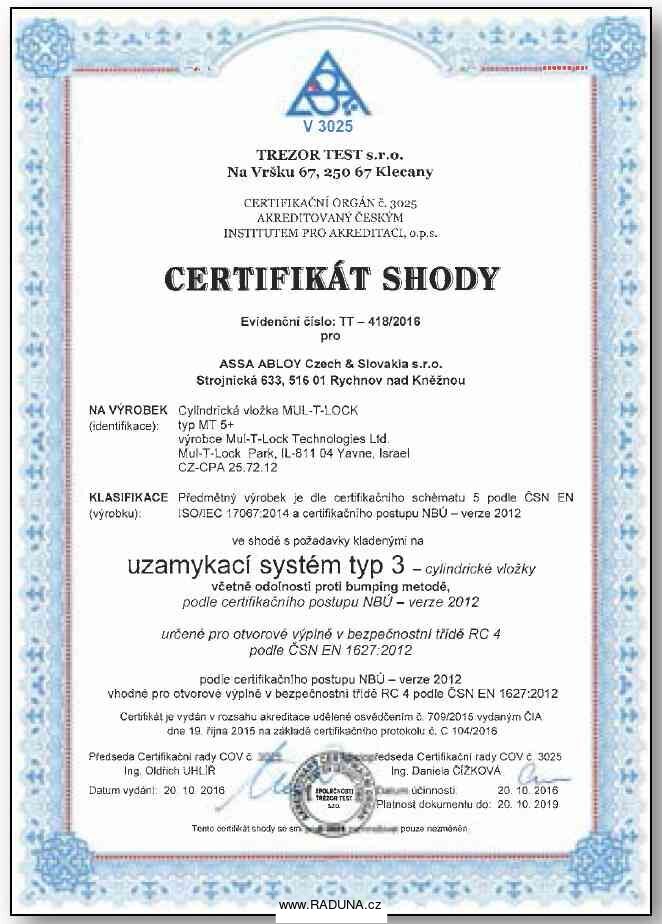 - výroba klíčů výhradně po předložení magnetické bezpečnostní karty na výrobu klíčů pouze ve vybraných servisních střediscích vybavených speciálním strojem Mul-T-Lock KC5®